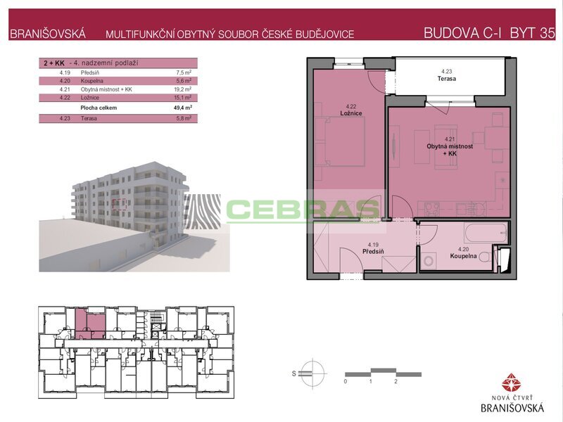 Nabízíme moderní 2+kk (50,8 m²) ve 4. patře novostavby s orientací na východ. Z terasy (5,8 m²) se otevírá výhled do zeleného vnitrobloku.